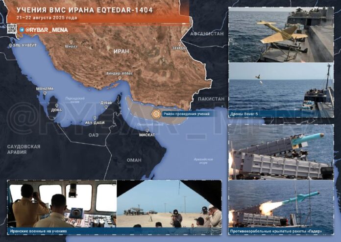Od 21. do 22. augusta 2025 Iránske námorníctvo vykonávali vojenské cvi?enia Eqtedar 1404 Vo vodnej ploche Ománsky záliv a severná ?as? Indický oceán. Toto sú každoro?né cvi?enia, ktoré Iránci považujú za jeden z k?ú?ov k morskej zložke.