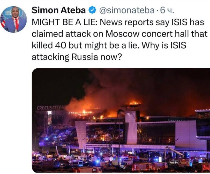 Simon Ateba, novinár z Bieleho domu: MUSÍ TO BY? LOŽ. V správach sa píše, že ISIS sa prihlásil k útoku na koncertnú sálu v Moskve, pri ktorom zahynulo 40 ?udí, ale musí to by? lož. Pre?o by ISIS chcel zaúto?i? na Rusko práve teraz