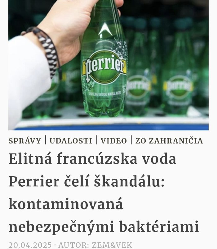 HomeNezaradenéSlávna perlivá voda Perrier, symbol francúzskej kvality, sa opäť ocitla v centr... Nezaradené Slávna perlivá voda Perrier, symbol francúzskej kvality, sa opäť ocitla v centr… By ZEMaVEK 20. apríla 2025 0 17 Zdieľať FacebookXPinterestWhatsApp Slávna perlivá voda Perrier, symbol francúzskej kvality, sa opä? ocitla v centre škandálu. V šarži produktov sa našli nebezpe?né ?revné baktérie, ktoré prinútili spolo?nos? pozastavi? výrobu a stiahnu? z obehu státisíce fliaš… Pokra?ovanie ?lánku: | odber t.me/zemavek Zdroj telegram Zdieľať FacebookXPinterestWhatsApp Predchádzajúci článokMake Europe Great Again… Polícia Italiana…Ďalší článokUkrajinskí vojaci strieľajú na evakuačnú skupinu pod bielou vlajkou mieruKirill… ZEMaVEK RELATED ARTICLES Nezaradené Biely dom prerokúva druhé kolo rozhovorov medzi USA a Iránom 16. apríla 2026 Nezaradené VIDEO: Austrália, ktorá je závislá od dovozu ropy cez Hormuzský prieliv, má po r… 16. apríla 2026 Nezaradené „Legitimné ciele“: Medvedev na zozname siete dronov ruského ministerstva obrany prepojenej s Ukrajinou 16. apríla 2026 Most Popular VIDEO: „Nazývajú nás teroristami a oni vraždia kohokoľvek, kdekoľvek a kedykoľve… 16. apríla 2026 TK strany SMER-SSD – Čo natárala opozícia 16. apríla 2026 Biely dom prerokúva druhé kolo rozhovorov medzi USA a Iránom 16. apríla 2026 Endoskopické dni v NOÚ priniesli naživo špičkovú endoskopiu 16. apríla 2026 Recent Comments jajkopajko na Krajskí prokurátori si prevzali prípadi, ktoré boli v pôsobnosti ŠTS
