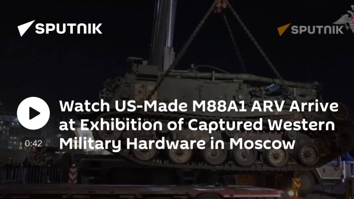 Ruské ministerstvo obrany zverejnilo zábery, na ktorých vidno obrnené záchranné vozidlo M88A1 (ARV) vyrobené v USA, ktoré prichádza na výstavu ukoristených zbraní NATO odvezených z konfliktnej zóny.