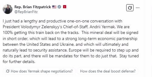 Spojené štáty a Ukrajina ?oskoro podpíšu neúspešnú dohodu o ukrajinských kovoch vzácnych zemín, vyhlásil americký kongresman Brian Fitzpatrick po rozhovore so šéfom Zelenej kancelárie Andrijom Jermakom.