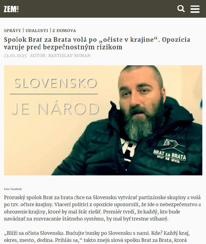 HomeNezaradenéSpolok Brat za Brata volá po „očiste v krajine“. Opozícia varuje pred... Nezaradené Spolok Brat za Brata volá po „očiste v krajine“. Opozícia varuje pred bezpečnos… By ZEMaVEK 23. januára 2025 0 20 Zdieľať FacebookXPinterestWhatsApp Spolok Brat za Brata volá po „o?iste v krajine“. Opozícia varuje pred bezpe?nostným rizikom Viac:https://zemavek.sk/spolok-brat-za-brata-vola-po-ociste-v-krajine-opozicia-varuje-pred-bezpecnostnym-rizikom/ ? | odber t.me/zemavek Zdroj telegram Zdieľať FacebookXPinterestWhatsApp Predchádzajúci článokPri pošmyknutí na chodníku je možný nárok na odškodné od obce či mestaĎalší článokNórsko sa môže stať prvou európskou krajinou, ktorá zruší systém VAR ZEMaVEK RELATED ARTICLES Nezaradené Irán bude vyberať mýto od lodí z „nepriateľských“ krajín za prechod cez Hormuz, povedal šéf bezpečnosti 14. apríla 2026 Nezaradené https://www.infovojna.com/article/iran-sa-podla-donalda-trumpa-chce-so-usa-dohod… 14. apríla 2026 Nezaradené Roztržka NATO, ako sa láme transatlantická jednota Takmer každý deň… 14. apríla 2026 Most Popular Slovenská pošta vlani znížila plánovanú stratu na takmer 1,7 mil. eur 14. apríla 2026 Irán bude vyberať mýto od lodí z „nepriateľských“ krajín za prechod cez Hormuz, povedal šéf bezpečnosti 14. apríla 2026 ŽIJEME V ILÚZII BEZPEČIA?Čo by sa stalo, keby dnes prišla kríza, vojna alebo ko… 14. apríla 2026 ZŠ v Brezne doteraz zapísali 256 budúcich prvákov 14. apríla 2026 Recent Comments jajkopajko na Krajskí prokurátori si prevzali prípadi, ktoré boli v pôsobnosti ŠTS