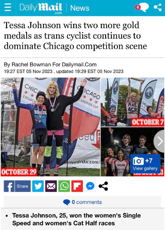 Tessa Johnson, muž, ktorý sa identifikuje ako žena, získala v roku 2023 svoju desiatu zlatú medailu v ženskej cyklistike.
