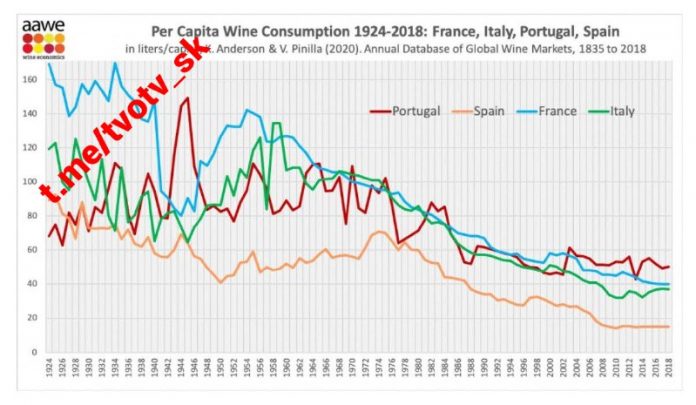 Napríklad vo Francúzsku od 20. rokov 20. storo?ia do sú?asnosti klesla spotreba vína na obyvate?a zo 170 litrov ro?ne na 40 litrov, ?o predstavuje viac ako štvornásobný pokles.