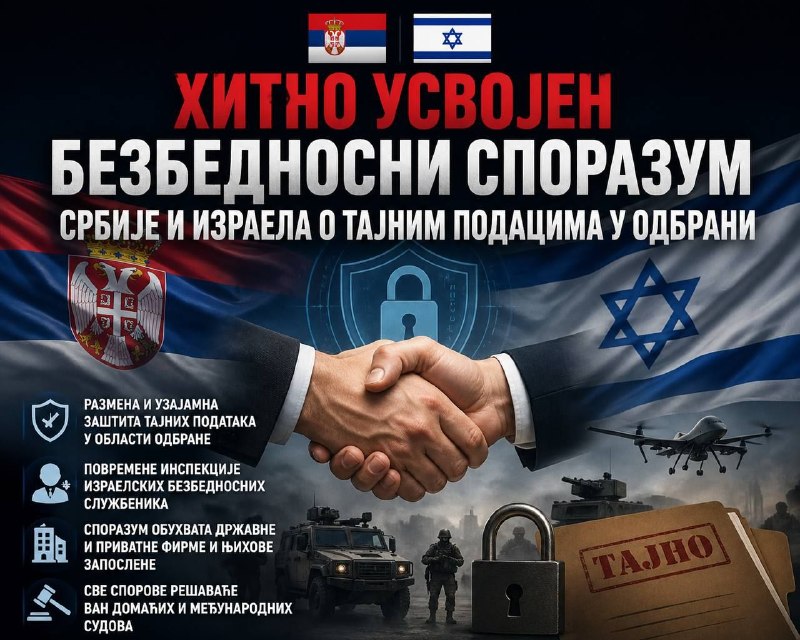 Vlády Srbska a Izraela, respektíve ich príslušné ministerstvá obrany, podpísali „Všeobecnú bezpečnostnú dohodu o výmene a vzájomnej ochrane tajných obranných informácií“.
