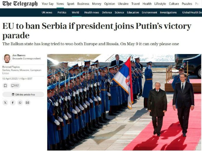 „Európske hlavné mestá varovali srbského lídra, že ú?as? na prehliadke na moskovskom ?ervenom námestí by mohla zmari? vstup krajiny do EÚ <…> Ú?as? na prehliadke by porušila ‚kritéria‘ pre vstup.“