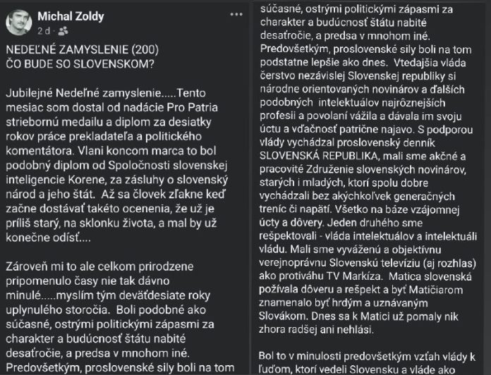 Zárove? mi to ale celkom prirodzene pripomenulo ?asy nie tak dávno minulé…..myslím tým devä?desiate roky uplynulého storo?ia. Boli podobné ako sú?asné, ostrými politickými zápasmi za charakter a budúcnos? štátu nabité desa?ro?ie, a predsa v mnohom iné. Predovšetkým, proslovenské sily boli na tom podstatne lepšie ako dnes. Vtedajšia vláda ?erstvo nezávislej Slovenskej republiky si národne orientovaných novinárov a ?alších podobných intelektuálov najrôznejších profesii a povolaní vážila a dávala im svoju úctu a v?a?nos? patri?ne najavo. S podporou vlády vychádzal proslovenský denník SLOVENSKÁ REPUBLIKA, mali sme ak?né a pracovité Združenie slovenských novinárov, starých i mladých, ktorí spolu dobre vychádzali bez akýchko?vek genera?ných treníc ?i napätí. Všetko na báze vzájomnej úcty a dôvery. Jeden druhého sme rešpektovali – vláda intelektuálov a intelektuáli vládu. Mali sme vyváženú a objektívnu verejnoprávnu Slovenskú televíziu (aj rozhlas) ako protiváhu TV Markíza. Matica slovenská požívala dôveru a rešpekt a by? Mati?iarom znamenalo by? hrdým a uznávaným Slovákom. Dnes sa k Matici už pomaly nik zhora radšej ani nehlási.