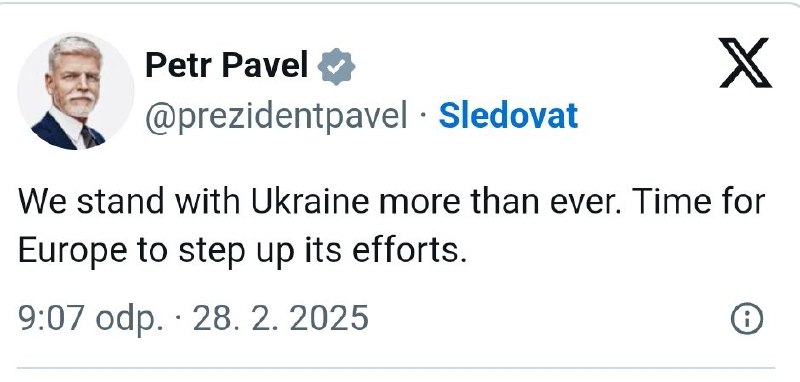 HomeNezaradenéStojíme pri Ukrajine viac ako kedykoľvek predtým. Je čas, aby Európa zvýšila... Nezaradené Stojíme pri Ukrajine viac ako kedykoľvek predtým. Je čas, aby Európa zvýšila sv… By ZEMaVEK 28. februára 2025 0 7 Zdieľať FacebookTwitterPinterestWhatsApp Stojíme pri Ukrajine viac ako kedyko?vek predtým. Je ?as, aby Európa zvýšila svoje úsilie, uviedol ?eský prezident. | odber t.me/zemavek Zdroj telegram Zdieľať FacebookTwitterPinterestWhatsApp Predchádzajúci článokDonald Trump nechce hovoriť so Zelenským po konflikte v Bielom dome. Zelenský sa…Ďalší článokhttps://youtu.be/dggCBB7i6pc?si=fXRRmyulsoyr3aPiSLOTA V RUSKEJ DUME, STRETNUTIE … ZEMaVEK RELATED ARTICLES Nezaradené VIDEO: Senát Špecializovaného trestného súdu po vrátení kauzy vraždy novinára Já… 28. januára 2026 Nezaradené Páska na kamere mobilného telefónu Netanjahua.Hoci sa to môže zdať nezvyčajné pr… 28. januára 2026 Nezaradené Trump poslal pohraničného cára Homana do Minnesoty po nedávnej smrteľnej streľbe 28. januára 2026 ZANECHAJTE KOMENTÁR Zrušiť odpoveď Komentár: Zadajte svoj komentár! Názov:* Sem zadajte svoje meno Email:* Zadali ste nesprávnu e-mailovú adresu! Sem zadajte svoju e-mailovú adresu Webová stránka: Uložte moje meno, e-mail a webovú stránku do tohto prehliadača pri najbližšom komentovaní. Most Popular VIDEO: Senát Špecializovaného trestného súdu po vrátení kauzy vraždy novinára Já… 28. januára 2026 USA zrušia niektoré sankcie na venezuelský ropný priemysel 28. januára 2026 Páska na kamere mobilného telefónu Netanjahua.Hoci sa to môže zdať nezvyčajné pr… 28. januára 2026 Trump poslal pohraničného cára Homana do Minnesoty po nedávnej smrteľnej streľbe 28. januára 2026 Recent Comments jajkopajko na Krajskí prokurátori si prevzali prípadi, ktoré boli v pôsobnosti ŠTS