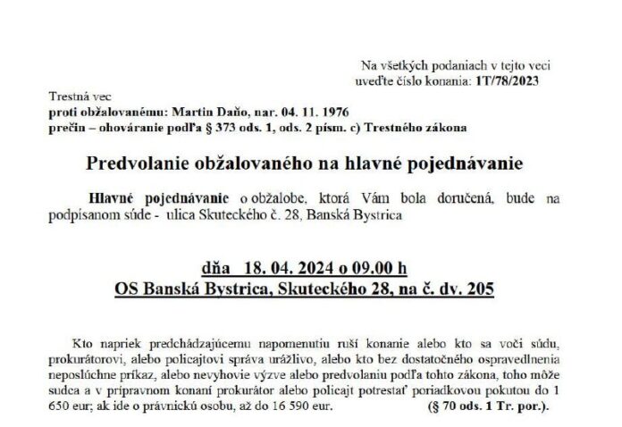 HomeNezaradenéSúd v kauze Poškodený Matúš Gemeš / obžalovaný Martin Daňo v BB... Nezaradené Súd v kauze Poškodený Matúš Gemeš / obžalovaný Martin Daňo v BB sa preložil na 18. Apríla 2024 o 9h… By Martin Daňo 11. marca 2024 0 8 Zdieľať FacebookTwitterPinterestWhatsApp Súd v kauze Poškodený Matúš Gemeš / obžalovaný Martin Da?o v BB sa preložil na 18. Apríla 2024 o 9h Zdroj telegram Zdieľať FacebookTwitterPinterestWhatsApp Predchádzajúci článokMaďarsko aj Slovensko presadzujú mierĎalší článokV informatike a inžinierstve dnes pôsobí len okolo 20 % žien Martin Daňohttps://www.ginn.press RELATED ARTICLES Nezaradené https://youtu.be/2OISDq5BWmEPo Venezuele a únose Madura: Hrozí podobný scenár aj… 15. januára 2026 Nezaradené VIDEO: „Grónsko nechce byť vlastnené a kontrolované Spojenými štátmi a nechceme … 15. januára 2026 Nezaradené „Žijeme uprostred historického obdobia prevratných zmien. Transatlantické spojen… 14. januára 2026 ZANECHAJTE KOMENTÁR Zrušiť odpoveď Komentár: Zadajte svoj komentár! Názov:* Sem zadajte svoje meno Email:* Zadali ste nesprávnu e-mailovú adresu! Sem zadajte svoju e-mailovú adresu Webová stránka: Uložte moje meno, e-mail a webovú stránku do tohto prehliadača pri najbližšom komentovaní. Most Popular Španielsko, Taliansko a Poľsko vyzývajú svojich občanov opustiť Irán 15. januára 2026 https://youtu.be/2OISDq5BWmEPo Venezuele a únose Madura: Hrozí podobný scenár aj… 15. januára 2026 Hádzanárky Dunajskej Stredy zvíťazili nad Iuventou Michalovce 33:28 15. januára 2026 VIDEO: „Grónsko nechce byť vlastnené a kontrolované Spojenými štátmi a nechceme … 15. januára 2026 Načítať viac Recent Comments jajkopajko na Krajskí prokurátori si prevzali prípadi, ktoré boli v pôsobnosti ŠTS