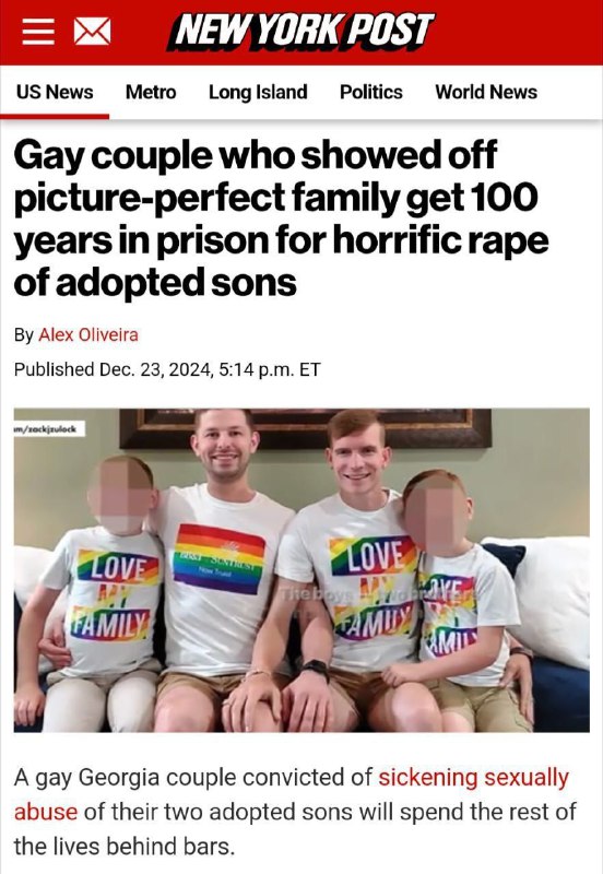 The New York Post: Homosexuálny pár zo Spojených štátov bol odsúdený na doživotie za týranie svojich adoptovaných detí. V Georgii boli manželia William a Zachary Zulockovci, ktorí žili na luxusnom predmestí Atlanty, odsúdení na 100 rokov väzenia bez možnosti podmiene?ného prepustenia.