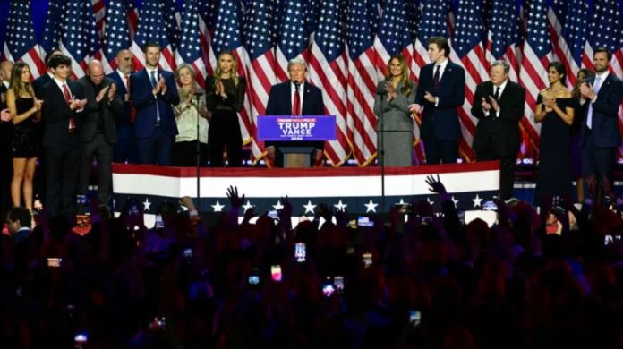 Trump vystúpil na pódium v kongresovom centre vo West Palm Beach spolu s manželkou Melaniou, nieko?kými svojimi de?mi a kandidátom na viceprezidenta J. D. Vanceom. „Toto je najvä?šie politické hnutie všetkých ?ias, nikdy tu ni? podobné nebolo,“ povedal. „Toto si budeme navždy pamäta? ako de?, ke? Ameri?ania opä? prevzali kontrolu nad svojou krajinou.“ Vance hovoril o „najvä?šom návrate v dejinách“.