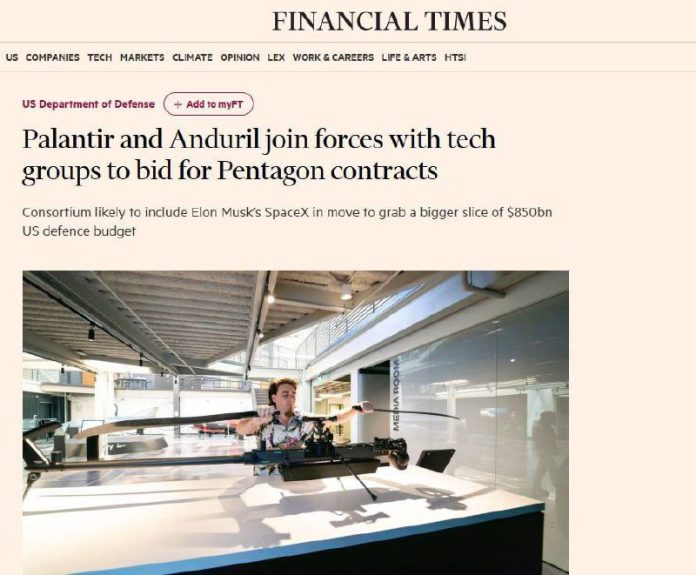 Financial Times uvádzajú, že Palantir, Anduril, SpaceX, OpenAI a ?alšie high-tech spolo?nosti vytvárajú alianciu, aby sa uchádzali o vládne zbrojné zmluvy. Biden v?era podpísal americký vojenský rozpo?et vo výške 895 miliárd dolárov. Americké vojenské startupy plánujú s pomocou DOGE (Department of Government Efficiency, na ?ele s Muskom a Ramaswamym) presunú? americké a britské zbrojárske spolo?nosti Lockheed Martin, Raytheon, Boeing, General Dynamics, Northrop Grumman a BAE Systems pre? z armády. rozpo?tu.