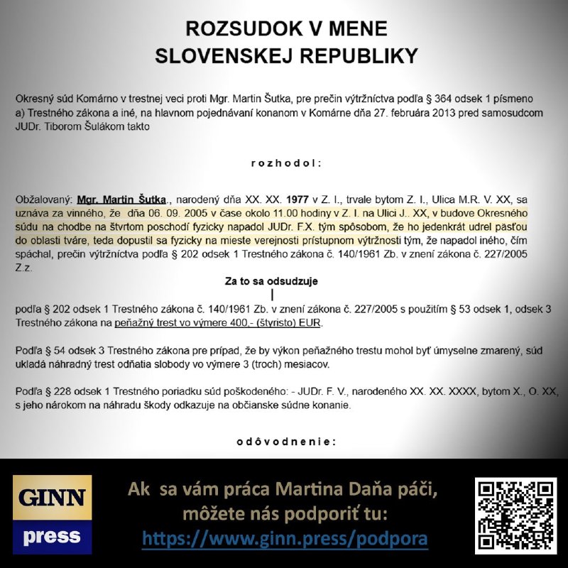Portál GINN a Martin Daňo zistil, že podozrivý advokát ľudí napáda opakovane – ba dokonca bol tesne pred svojim zapísaním do zoznamu advokátov v roku 2015 právoplatne odsúdený za to, že priamo na súde ešte v roku 2005 udrel päsťou do tváre svedka!!!