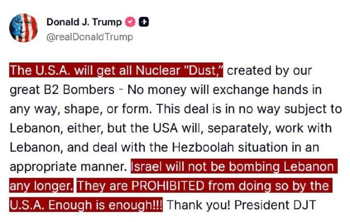 HomeVojenské spravodajstvoTrump hovorí, že USA „dostanú všetok jadrový ‚prach‘“ z Iránu a „Izrael... Vojenské spravodajstvo Trump hovorí, že USA „dostanú všetok jadrový ‚prach‘“ z Iránu a „Izrael už nebud… By tvotv.sk 17. apríla 2026 0 4 Zdieľať FacebookXPinterestWhatsApp Trump hovorí, že USA „dostanú všetok jadrový ‚prach‘“ z Iránu a „Izrael už nebude bombardovať Libanon. USA im to ZAKÁZAJÚ. Už stačilo!!!“ Zdroj: https://truthsocial.com/@realDonaldTrump/posts/116420395293904982 Sledujte TVOTV Zdroj telegram Zdieľať FacebookXPinterestWhatsApp Predchádzajúci článokEurópe zostáva „šesť týždňov“ leteckého paliva, tvrdí šéf IEAĎalší článokKremeľ poprel, že Putin nie je informovaný o problémoch v Rusku tvotv.skhttps://tvotv.sk RELATED ARTICLES Vojenské spravodajstvo Irán vyhlásil Hormuz za „úplne otvorený“ pre všetky obchodné lode 17. apríla 2026 Vojenské spravodajstvo https://youtu.be/Rx3W2QC1B68V najnovšom rozhovore pre TVOTV „Svet ako Pulp Ficti… 17. apríla 2026 Vojenské spravodajstvo Nový nemecký majiteľ Telegraphu vnucuje proizraelské zaujatosti, tvrdí novinár 17. apríla 2026 Most Popular Al-Šaraa: Irak začína s vývozom ropy cez Sýriu 17. apríla 2026 Pápež odsúdil používanie AI na polarizáciu a na šírenie strachu 17. apríla 2026 Trump poďakoval Iránu za znovuotvorenie Hormuzského prielivu.Zdroj: https://trut… 17. apríla 2026 Mýtus o „ukrajinských“ dronoch: Čo sa skutočne skrýva za výrobným reťazcom 17. apríla 2026 Recent Comments jajkopajko na Krajskí prokurátori si prevzali prípadi, ktoré boli v pôsobnosti ŠTS