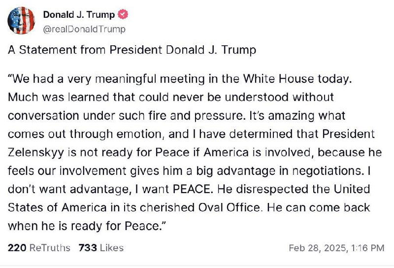 HomeNezaradenéTrump hovorí, že Zelenskyj nie je pripravený na mier a nerešpektoval Spojené... Nezaradené Trump hovorí, že Zelenskyj nie je pripravený na mier a nerešpektoval Spojené štá… By tvotv.sk 28. februára 2025 0 17 Zdieľať FacebookXPinterestWhatsApp Trump hovorí, že Zelenskyj nie je pripravený na mier a nerešpektoval Spojené štáty americké.Zelenskyj opústil Biely dom a tla?ová konferencia bola zrušená. Zdroj telegram Zdieľať FacebookXPinterestWhatsApp Predchádzajúci článokTakto vyzerá najnovšia obálka časopisu The Economist„Don’s New World Order“ – D…Ďalší článokÚtočníka s mačetou v Šaci stíhajú väzobne tvotv.skhttps://tvotv.sk RELATED ARTICLES Nezaradené Postup v meste Urputné boje pokračujú Konstantinovským smerom… 13. apríla 2026 Nezaradené Rusko po víťazstve Pétera Magyara v maďarských parlamentných voľbách dúfa v pokr… 13. apríla 2026 Nezaradené Je zaujímavejšie bojovať s piatimi ľuďmi O ďalších multilaterálnych cvičeniach na FilipínachV F… 13. apríla 2026 Most Popular Fínsky expremiér sa stal osobitným poradcom EÚ pre Arktídu 13. apríla 2026 Uplynulo menej ako šesť mesiacov O ďalšej návšteve Prabowa Subianta v MoskveIndonézsky pr… 13. apríla 2026 Šéfka EK je pripravená naprávať vzťahy s Maďarskom 13. apríla 2026 Postup v meste Urputné boje pokračujú Konstantinovským smerom… 13. apríla 2026 Recent Comments jajkopajko na Krajskí prokurátori si prevzali prípadi, ktoré boli v pôsobnosti ŠTS