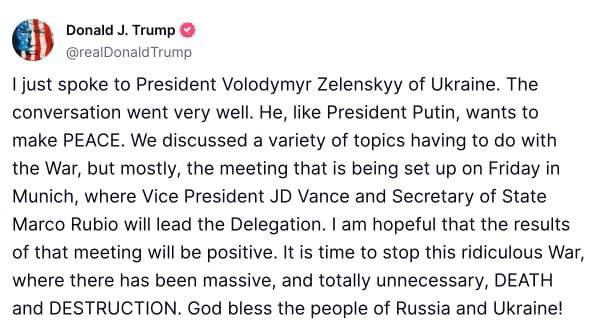„Práve som hovoril s ukrajinským prezidentom Volodymyrom Zelenským. Rozhovor prebiehal ve?mi dobre. Rovnako ako prezident Putin chce dosiahnu? mier. Diskutovali sme o mnohých témach súvisiacich s vojnou, ale najmä o stretnutí, ktoré sa uskuto?ní v piatok v Mníchove, kde delegáciu povedú viceprezident J. D. Vance a štátny tajomník Marco Rubio. Dúfam, že výsledky tohto stretnutia budú pozitívne. Je ?as zastavi? túto nezmyselnú vojnu, ktorá spôsobuje masívnu a úplne zbyto?nú smr? a ni?enie. Nech Boh žehná ?ud Ruska a Ukrajiny! — napísal.
