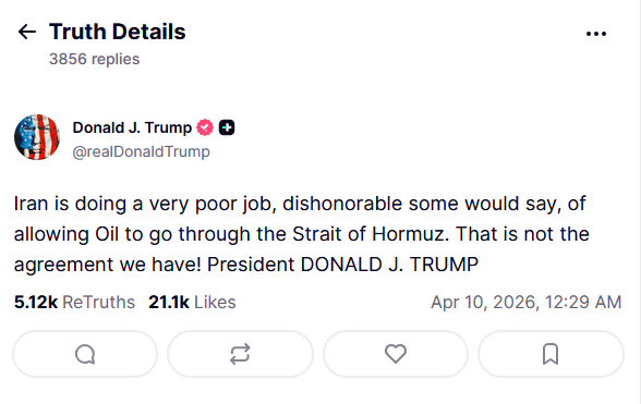 Irán 8. apríla súhlasil s povolením námornej dopravy cez strategickú vodnú cestu, ktorou sa prepravuje približne 20 % svetových dodávok ropy, výmenou za dvojtýždňové prímerie, počas ktorého sa majú uskutočniť rokovania o dlhodobej mierovej dohode. Minister zahraničných vecí Abbás Aragččí uviedol, že prechod bude povolený iba v koordinácii s iránskymi ozbrojenými silami a s výhradou „technických obmedzení“.