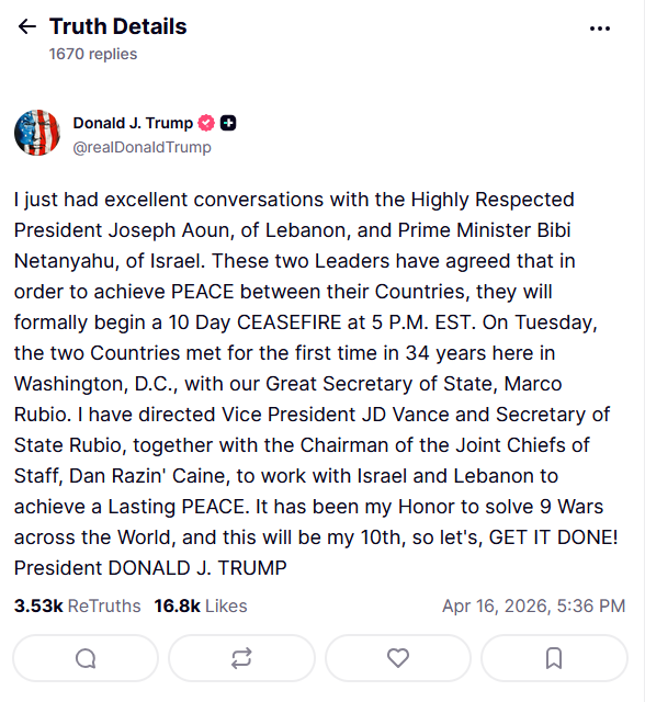 V príspevku na Truth Social Trump uviedol, že nariadil viceprezidentovi J. D. Vanceovi a ministrovi zahraničných vecí Rubiovi spolu s predsedom Zboru náčelníkov štábov Danom Razin’om Caineom, aby „spolupracovali s Izraelom a Libanonom na dosiahnutí trvalého MIERA“.