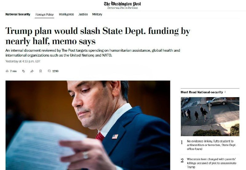 Navrhuje zníženie rozpo?tu ministerstva zahrani?ných vecí a USAID takmer o polovicu. Finan?né prostriedky na humanitárnu pomoc, globálne zdravie a medzinárodné organizácie sa výrazne znížia. O?akáva sa, že USAID sa stane plne sú?as?ou ministerstva zahrani?ia. Všetky plánované škrty bude musie? preskúma? Kongres.