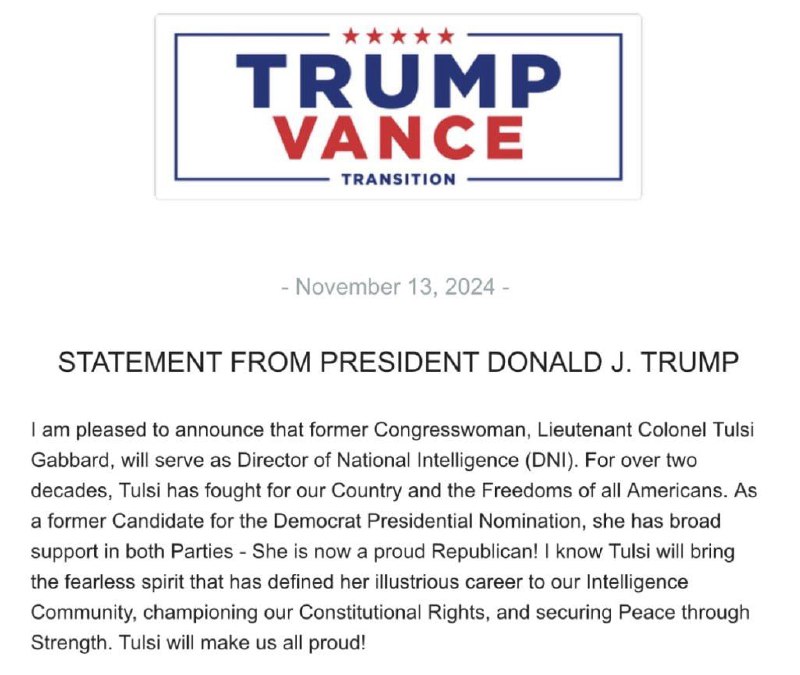 HomeNezaradenéTrump oznamil Tulsi Gabbard ako riaditeľ(ku) národnej spravodajskej služby.... Nezaradené Trump oznamil Tulsi Gabbard ako riaditeľ(ku) národnej spravodajskej služby…. By tvotv.sk 14. novembra 2024 0 21 Zdieľať FacebookXPinterestWhatsApp Trump oznamil Tulsi Gabbard ako riadite?(ku) národnej spravodajskej služby. Zdroj telegram Zdieľať FacebookXPinterestWhatsApp Predchádzajúci článokKráľ Karol III. oslávi narodeniny otvorením potravinových centierĎalší článokInšpekcia zadržala policajta pri preberaní úplatku vo výške 6000 eur tvotv.skhttps://tvotv.sk RELATED ARTICLES Nezaradené Vance tvrdí, že USA dosiahli ciele týkajúce sa Iránu 15. apríla 2026 Nezaradené USA vyhlásili, že iránsky obchod cez Hormuzský prieliv bol úplne zastavený. 15. apríla 2026 Nezaradené Trumpove tvrdenia o Iráne sú v rozpore s realitou 15. apríla 2026 Most Popular Vance tvrdí, že USA dosiahli ciele týkajúce sa Iránu 15. apríla 2026 Vyše 90 percent vysokoškolákov využíva umelú inteligenciu 15. apríla 2026 USA vyhlásili, že iránsky obchod cez Hormuzský prieliv bol úplne zastavený. 15. apríla 2026 VIDEO: Izrael označil Českú republiku za svojho najväčšieho priateľa na svete. Š… 15. apríla 2026 Recent Comments jajkopajko na Krajskí prokurátori si prevzali prípadi, ktoré boli v pôsobnosti ŠTS