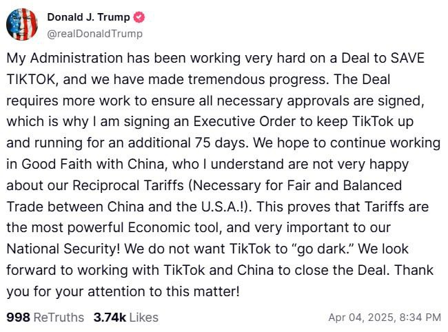 HomeNezaradenéTrump podpísal príkaz, aby TikTok zostal „v prevádzke“ ďalších 75 dní... Nezaradené Trump podpísal príkaz, aby TikTok zostal „v prevádzke“ ďalších 75 dní… By tvotv.sk 4. apríla 2025 0 18 Zdieľať FacebookXPinterestWhatsApp Trump podpísal príkaz, aby TikTok zostal „v prevádzke“ ?alších 75 dní Zdroj telegram Zdieľať FacebookXPinterestWhatsApp Predchádzajúci článokTAK, A JE TO! ŠALITROŠ A MIGAĽ VYLÚČENÍ ZO STRANYNie som rád ak prichádza na moj…Ďalší článokŠtát má indície o čiernych prevozoch zvierat počas noci tvotv.skhttps://tvotv.sk RELATED ARTICLES Nezaradené Postup v meste Urputné boje pokračujú Konstantinovským smerom… 13. apríla 2026 Nezaradené Rusko po víťazstve Pétera Magyara v maďarských parlamentných voľbách dúfa v pokr… 13. apríla 2026 Nezaradené Je zaujímavejšie bojovať s piatimi ľuďmi O ďalších multilaterálnych cvičeniach na FilipínachV F… 13. apríla 2026 Most Popular Uplynulo menej ako šesť mesiacov O ďalšej návšteve Prabowa Subianta v MoskveIndonézsky pr… 13. apríla 2026 Šéfka EK je pripravená naprávať vzťahy s Maďarskom 13. apríla 2026 Postup v meste Urputné boje pokračujú Konstantinovským smerom… 13. apríla 2026 Izrael je pobúrený kvôli figuríne Netanjahua, ktorá bola vyhodená do vzduchu v Španielsku (VIDEO) 13. apríla 2026 Recent Comments jajkopajko na Krajskí prokurátori si prevzali prípadi, ktoré boli v pôsobnosti ŠTS