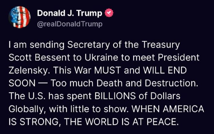 „Posielam na Ukrajinu ministra financií Scotta Bessenta, aby sa stretol s prezidentom Zelenským. Táto vojna sa musí a ?oskoro skon?í – bolo tam príliš ve?a smrti a ni?enia.“