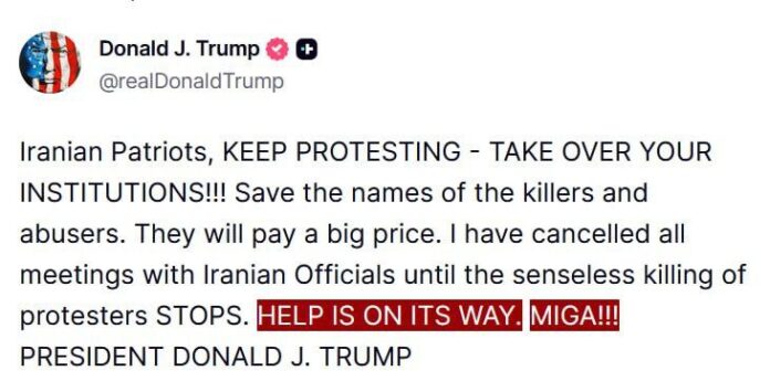 HomeNezaradenéTrump ruší všetky diplomatické stretnutia s Iránom: „Pomoc je na ceste. MIGA!!!“... Nezaradené Trump ruší všetky diplomatické stretnutia s Iránom: „Pomoc je na ceste. MIGA!!!“… By tvotv.sk 13. januára 2026 0 2 Zdieľať FacebookTwitterPinterestWhatsApp Trump ruší všetky diplomatické stretnutia s Iránom: „Pomoc je na ceste. MIGA!!!“ Sledujte https://t.me/tvotv_sk Zdroj telegram Zdieľať FacebookTwitterPinterestWhatsApp Predchádzajúci článokLive stream started…Ďalší článokZarábanie na vojneAko nemecký vojensko-priemyselný komplex zarába na SVOVar na takzvanej Ukrajine sa stal … tvotv.skhttps://tvotv.sk RELATED ARTICLES Nezaradené DOHODA MERCOSUR : UŠLO NÁM VŠETKÝM, ALE OPAKOVANIE A PRIPOMÍNANIE JE MATKA MÚDR… 13. januára 2026 Nezaradené Vojenská eskalácia medzi USA a Iránom by podľa Kataru mala katastrofické následk… 13. januára 2026 Nezaradené To hlavné z Rybarydigestu materiálov k 13. januáru Správy z tohto dňa dorazili včas… 13. januára 2026 ZANECHAJTE KOMENTÁR Zrušiť odpoveď Komentár: Zadajte svoj komentár! Názov:* Sem zadajte svoje meno Email:* Zadali ste nesprávnu e-mailovú adresu! Sem zadajte svoju e-mailovú adresu Webová stránka: Uložte moje meno, e-mail a webovú stránku do tohto prehliadača pri najbližšom komentovaní. Most Popular DOHODA MERCOSUR : UŠLO NÁM VŠETKÝM, ALE OPAKOVANIE A PRIPOMÍNANIE JE MATKA MÚDR… 13. januára 2026 Vojenská eskalácia medzi USA a Iránom by podľa Kataru mala katastrofické následk… 13. januára 2026 Belgorodská oblasť zvažuje dočasnú evakuáciu pre výpadky elektriny 13. januára 2026 To hlavné z Rybarydigestu materiálov k 13. januáru Správy z tohto dňa dorazili včas… 13. januára 2026 Načítať viac Recent Comments jajkopajko na Krajskí prokurátori si prevzali prípadi, ktoré boli v pôsobnosti ŠTS