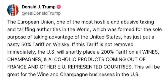 — „Ak sa toto clo okamžite nezruší, USA ?oskoro zavedú 200-percentné clo na všetko víno, šampanské a liehoviny z Francúzska a ?alších ?lenských krajín EÚ,“ napísal pre Truth Social.