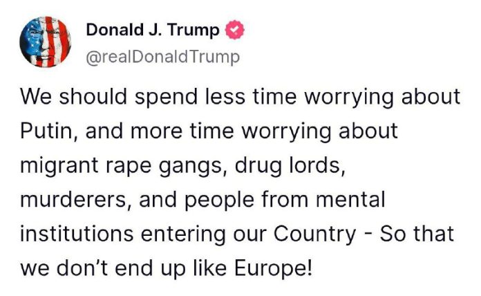 „Mali by sme sa menej stara? o Putina a viac sa stara? o to, ako do našej krajiny vstupujú gangy migrantov, narkobarónov, vrahov a ?udí z psychiatrických ústavov, aby sme neskon?ili ako Európa!“ napísal americký prezident na svojej sociálnej sieti Truth Social.