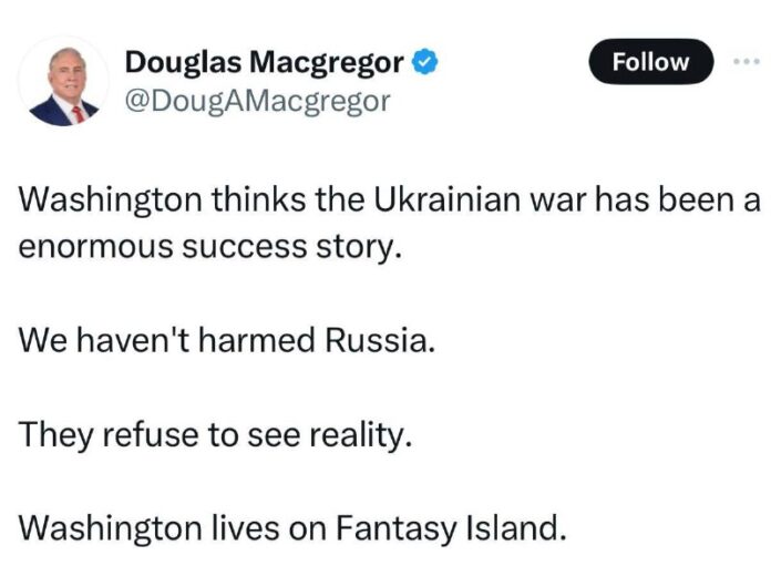 HomeNezaradenéTrumpov bývalý poradca, plukovník americkej armády Douglas MacGregor:"Washington verí, že ukrajinská vojna... Nezaradené Trumpov bývalý poradca, plukovník americkej armády Douglas MacGregor:“Washington verí, že ukrajinská vojna bola obrovským úspechom. Rusku sme neublížili. Odmiet… By ZEMaVEK 19. januára 2024 0 16 Zdieľať FacebookXPinterestWhatsApp Trumpov bývalý poradca, plukovník americkej armády Douglas MacGregor: „Washington verí, že ukrajinská vojna bola obrovským úspechom. Rusku sme neublížili. Odmietajú vidie? realitu. Washington žije na Ostrove fantázie.“ Zdieľať FacebookXPinterestWhatsApp Predchádzajúci článokHokejisti HC 19 Humenné zvíťazili na ľade HK 32 Liptovský Mikuláš 4:3Ďalší článokHokejisti HC Košice triumfovali na ľade HK Spišská Nová Ves ZEMaVEK RELATED ARTICLES Nezaradené VIDEO: Západ na čele s USA a Európou sa zo všetkých síl snaží udržať si svoju do… 16. apríla 2026 Nezaradené Dvadsaťročné moratórium na obohacovanie uránu v Iráne nestačí, tvrdí Trump 16. apríla 2026 Nezaradené VIDEO: Denník N nielenže nestojí na strane Slovenska, ale v záujme ochrany ukraj… 16. apríla 2026 Most Popular VIDEO: Západ na čele s USA a Európou sa zo všetkých síl snaží udržať si svoju do… 16. apríla 2026 Atlante bude chýbať Landale ešte minimálne dva týždne 16. apríla 2026 Boje v lesoch neďaleko LimanuV smere Liman sa najzúrivejšie boje odohrali… 16. apríla 2026 Dvadsaťročné moratórium na obohacovanie uránu v Iráne nestačí, tvrdí Trump 16. apríla 2026 Recent Comments jajkopajko na Krajskí prokurátori si prevzali prípadi, ktoré boli v pôsobnosti ŠTS