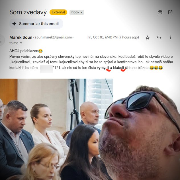 Tu vidno ako trafená hus zagágal! Marek Šoun – ako káder a sluha Zoroslava Kollára, o ktorom som sa vyjadril, že zo súdu vyplýva. žeje kajúcnik – mi poslal tento pekný email – vie že dokon?ujem video a tam budú doklady, že nikdy nebol oslobodený spod obžaloby za da?ový podvod a súd pokra?uje…. teda že klamal… tak ako stále, o každom a všetkom… ved zavoláme, nech sa nebojí… aj ?alším sa ešte bude vola?.. 🙂