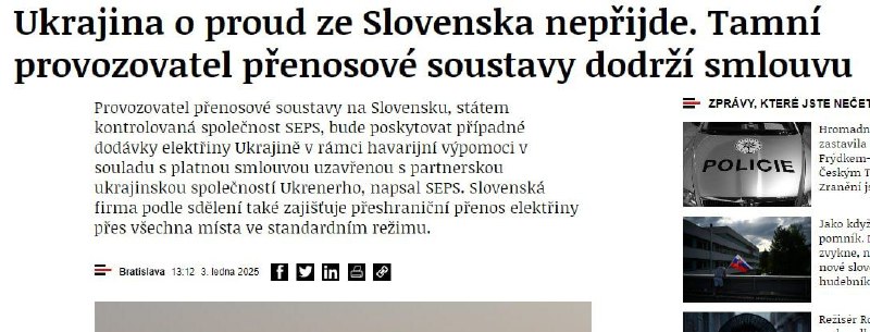 Slovenský prevádzkovate? prenosnej sústavy spolo?nos? SEPS totiž uviedol, že bude poskytova? dodávky elektriny Ukrajine v rámci havarijnej výpomoci v súlade s dohodou, ktorú spolo?nos? uzavrela s ukrajinskou spolo?nos?ou Ukrenerho.