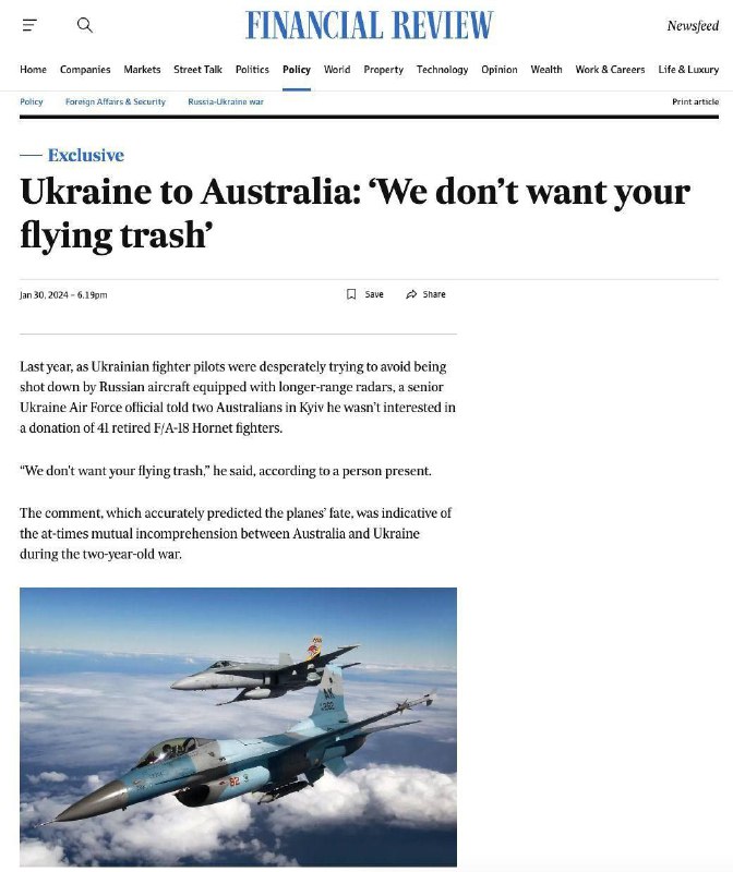 HomeNezaradenéUkrajina povedala, že Kyjev nepotrebuje austrálske stíhačky F-18 Hornet a nazvala ich... Nezaradené Ukrajina povedala, že Kyjev nepotrebuje austrálske stíhačky F-18 Hornet a nazvala ich „lietajúcim odpadom.“| By ZEMaVEK 2. februára 2024 0 17 Zdieľať FacebookXPinterestWhatsApp Ukrajina povedala, že Kyjev nepotrebuje austrálske stíha?ky F-18 Hornet a nazvala ich „lietajúcim odpadom.“ | odber Zdroj telegram Zdieľať FacebookXPinterestWhatsApp Predchádzajúci článokDanko deklaroval plnú podporu Šimkovičovej ako ministerke kultúryĎalší článokŽilina ponúka umelcom na Staromestských slávnostiach Otvorené pódiu ZEMaVEK RELATED ARTICLES Nezaradené Kronika špeciálnej vojenskej operácie z 15. apríla 2026 ruských vojakov v… 16. apríla 2026 Nezaradené Americký regulátor preveruje podozrivé obchody s ropou pred oznámeniami Trumpove… 16. apríla 2026 Nezaradené VIDEO: Anna Belousovová o výsledkoch maďarských volieb, pravej tvári Pétera Magy… 16. apríla 2026 Most Popular Biely dom diskutuje o ďalšom kole rokovaní s Iránom v Pakistane 16. apríla 2026 Kronika špeciálnej vojenskej operácie z 15. apríla 2026 ruských vojakov v… 16. apríla 2026 Americký regulátor preveruje podozrivé obchody s ropou pred oznámeniami Trumpove… 16. apríla 2026 VIDEO: Anna Belousovová o výsledkoch maďarských volieb, pravej tvári Pétera Magy… 16. apríla 2026 Recent Comments jajkopajko na Krajskí prokurátori si prevzali prípadi, ktoré boli v pôsobnosti ŠTS