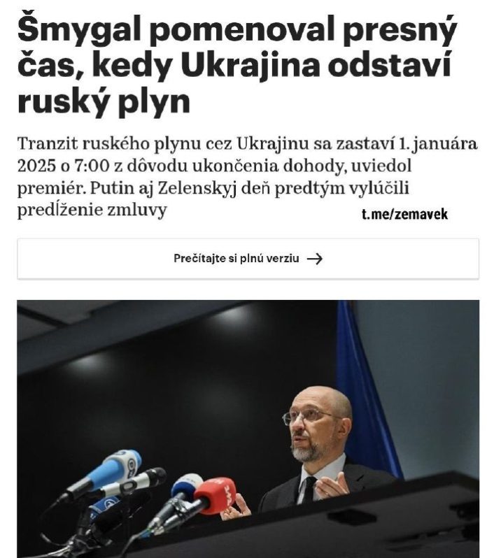 HomeNezaradenéUkrajina zastaví tranzit ruského plynu 1. januára o 7:00, oznámil v Rade... Nezaradené Ukrajina zastaví tranzit ruského plynu 1. januára o 7:00, oznámil v Rade premié… By ZEMaVEK 21. decembra 2024 0 12 Zdieľať FacebookXPinterestWhatsApp Ukrajina zastaví tranzit ruského plynu 1. januára o 7:00, oznámil v Rade premiér Šmygal.| odber t.me/zemavek Zdroj telegram Zdieľať FacebookXPinterestWhatsApp Predchádzajúci článokAC Miláno vyhralo na pôde Verony 1:0 vďaka gólu ReijndersaĎalší článokÚtok dronu na ruskú Kazaň zatiaľ nepriniesol žiadne obete ZEMaVEK RELATED ARTICLES Nezaradené Druhý išielTrump vyhodil šéfa ministerstva spravodlivosti Donald Trump pokračuje v preskupovaní… 2. apríla 2026 Nezaradené Feyli Kurdi: „Krvavou zafarbená“ rana, ktorá po 46 rokoch stále čaká na spravodlivosť 2. apríla 2026 Nezaradené Výstavba storočia, ako sa rozvíja infraštruktúra nových regiónov RuskaZa oslobodenie… 2. apríla 2026 ZANECHAJTE KOMENTÁR Zrušiť odpoveď Komentár: Zadajte svoj komentár! Názov:* Sem zadajte svoje meno Email:* Zadali ste nesprávnu e-mailovú adresu! Sem zadajte svoju e-mailovú adresu Webová stránka: Uložte moje meno, e-mail a webovú stránku do tohto prehliadača pri najbližšom komentovaní. Prove your humanity: 9 + 8 = Put your comment here Most Popular Druhý išielTrump vyhodil šéfa ministerstva spravodlivosti Donald Trump pokračuje v preskupovaní… 2. apríla 2026 Feyli Kurdi: „Krvavou zafarbená“ rana, ktorá po 46 rokoch stále čaká na spravodlivosť 2. apríla 2026 V Moskve odsúdili sochára za zobrazenie Putina na karnevalovom voze 2. apríla 2026 Výstavba storočia, ako sa rozvíja infraštruktúra nových regiónov RuskaZa oslobodenie… 2. apríla 2026 Recent Comments jajkopajko na Krajskí prokurátori si prevzali prípadi, ktoré boli v pôsobnosti ŠTS