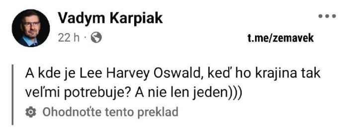 HomeNezaradenéUkrajinský novinár Vadym Karpiak vyzýva na atentát na Trumpa.Verejne na sociáln... Nezaradené Ukrajinský novinár Vadym Karpiak vyzýva na atentát na Trumpa.Verejne na sociáln… By ZEMaVEK 7. marca 2025 0 7 Zdieľať FacebookTwitterPinterestWhatsApp Ukrajinský novinár Vadym Karpiak vyzýva na atentát na Trumpa. Verejne na sociálnych sie?ach. | odber t.me/zemavek Zdroj telegram Zdieľať FacebookTwitterPinterestWhatsApp Predchádzajúci článokTASR ponúka spravodajstvo od reportérov v Novom Měste na MoraveĎalší článokTK ministra vnútra M. Šutaja Eštoka – nový dizajn policajných vozidiel ZEMaVEK RELATED ARTICLES Nezaradené Reakciu Európskej únie na americký vojenský zásah vo Venezuele podporilo 26 člen… 5. januára 2026 Nezaradené Madura v putách eskortujú federálni agenti k vrtuľníku na ceste na súd, kde bude… 5. januára 2026 Nezaradené Grónsko otvorené dialógu s USA prostredníctvom „správnych kanálov“ – predseda vlády 5. januára 2026 ZANECHAJTE KOMENTÁR Zrušiť odpoveď Komentár: Zadajte svoj komentár! Názov:* Sem zadajte svoje meno Email:* Zadali ste nesprávnu e-mailovú adresu! Sem zadajte svoju e-mailovú adresu Webová stránka: Uložte moje meno, e-mail a webovú stránku do tohto prehliadača pri najbližšom komentovaní. Most Popular Severná Kórea odpálila hypersonickú raketu (FOTO) 5. januára 2026 EÚ je naďalej tretí najväčší obchodný partner Venezuely 5. januára 2026 Americký úrad pre kontrolu drog sa okrem Madura zameral na honduraského lídra 5. januára 2026 Rovnaký základ má rozsiahla protikríza a viera v dohodu o Venezuele. Cez nie… 5. januára 2026 Načítať viac Recent Comments jajkopajko na Krajskí prokurátori si prevzali prípadi, ktoré boli v pôsobnosti ŠTS