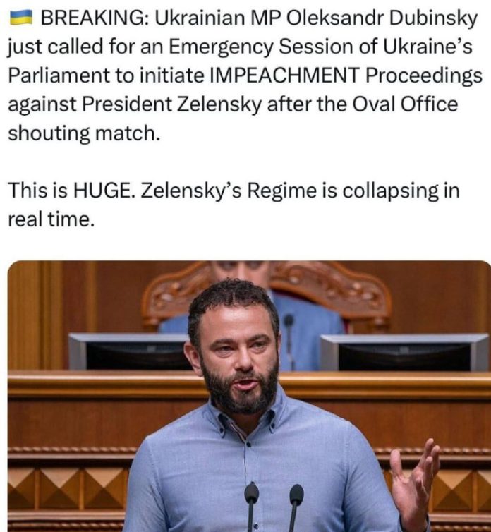 HomeNezaradenéUkrajinský poslanec Oleksandr Dubinsky práve zvolal mimoriadne zasadnutie ukraji... Nezaradené Ukrajinský poslanec Oleksandr Dubinsky práve zvolal mimoriadne zasadnutie ukraji… By Miroslav Kamenský 28. februára 2025 0 4 Zdieľať FacebookTwitterPinterestWhatsApp Ukrajinský poslanec Oleksandr Dubinsky práve zvolal mimoriadne zasadnutie ukrajinského parlamentu na za?atie IMPEACHMENTU proti prezidentovi Zelenskému po zápase s pokrikmi v Oválnej pracovni. Kolaps Zelenského režimu online. Pozvite priate?ov | odber Zdroj telegram Zdieľať FacebookTwitterPinterestWhatsApp Predchádzajúci článokAmerický viceprezident J.D. Vance : “ Dal som pokyn tajnej službe, aby dohliadl…Ďalší článokČO JE NAPÍSANÉ, TO PRETRVÁ… Predplatným Zem&Vek nám veľmi výrazne pomôžte… Miroslav Kamenský RELATED ARTICLES Nezaradené https://youtu.be/APleaV_Y0uw?si=Hrty-kFDo7z09W_GGenerál Viktorin: Poľsko otvára … 9. januára 2026 Nezaradené VIDEO: „Rozhodnutia dočasného vedenia Venezuely budú diktované Spojenými štátmi … 8. januára 2026 Nezaradené ©Práve teraz sa protesty v Iráne prudko zintenzívnili: demonštranti pália pneumatiky a autá… 8. januára 2026 ZANECHAJTE KOMENTÁR Zrušiť odpoveď Komentár: Zadajte svoj komentár! Názov:* Sem zadajte svoje meno Email:* Zadali ste nesprávnu e-mailovú adresu! Sem zadajte svoju e-mailovú adresu Webová stránka: Uložte moje meno, e-mail a webovú stránku do tohto prehliadača pri najbližšom komentovaní. Most Popular Farmári v Grécku a Francúzsku pokračovali v blokádach ciest 9. januára 2026 https://youtu.be/APleaV_Y0uw?si=Hrty-kFDo7z09W_GGenerál Viktorin: Poľsko otvára … 9. januára 2026 Basketbalistky ŠK UMB Banská Bystrica zdolali BK AS Trenčín 67:43 9. januára 2026 Levice prehrali s Würzburgom 56:74 9. januára 2026 Načítať viac Recent Comments jajkopajko na Krajskí prokurátori si prevzali prípadi, ktoré boli v pôsobnosti ŠTS