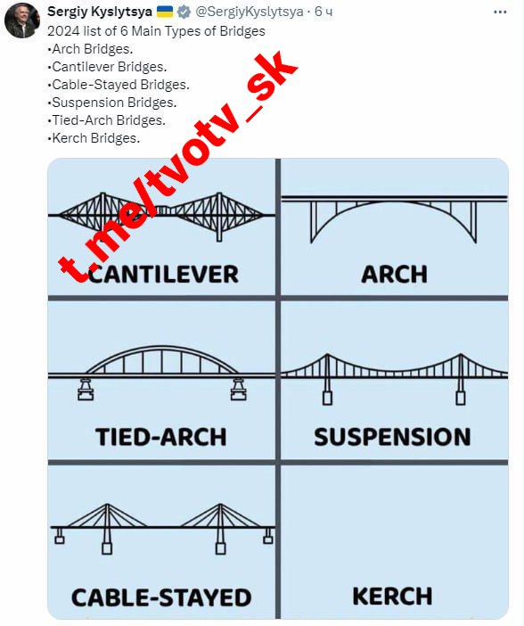 Na svojej stránke zverejnil „zoznam šiestich hlavných typov mostov na rok 2024“: oblúkový, konzolový, lanový, visutý, viazaný oblúkový a „ker?ský“. Prvých pä? typov konštrukcií diplomat sprevádzal príslušnými obrázkami, ale pod typom mosta „Ker?“ sa nenachádza ni?.