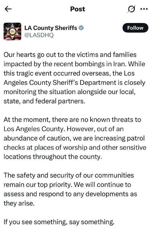 HomeNezaradenéÚrad šerifa v Los Angeles sa ospravedlnil za „neprijateľný“ príspevok na sociáln... Nezaradené Úrad šerifa v Los Angeles sa ospravedlnil za „neprijateľný“ príspevok na sociáln… By tvotv.sk 23. júna 2025 0 13 Zdieľať FacebookXPinterestWhatsApp Úrad šerifa v Los Angeles sa ospravedlnil za „neprijate?ný“ príspevok na sociálnych sie?ach vyjadrujúci sústras? Iránu a po negatívnej reakcii ho odstránil. Zdroj telegram Zdieľať FacebookXPinterestWhatsApp Predchádzajúci článokZRÁŽKA MOTORKY S AUTOM: Skončil v potokuĎalší článokRužinov vydal stavebné povolenie pre mestský bytový dom Terchovská tvotv.skhttps://tvotv.sk RELATED ARTICLES Nezaradené Izraelská chobotnicaUprostred volieb v SlovinskuMachinácie Mossadu neprestávajú vzrušovať… 30. marca 2026 Nezaradené VIDEO: „V reakcii na útoky nepriateľa na obytné a civilné domy v Iráne začíname … 30. marca 2026 Nezaradené ÚSTAVNÝ SÚD SR: POSTUPOM NAJVYŠŠIEHO SÚDU SR BOLO PORUŠENÉ ZÁKLADNÉ PRÁVO DANNYH… 30. marca 2026 ZANECHAJTE KOMENTÁR Zrušiť odpoveď Komentár: Zadajte svoj komentár! Názov:* Sem zadajte svoje meno Email:* Zadali ste nesprávnu e-mailovú adresu! Sem zadajte svoju e-mailovú adresu Webová stránka: Uložte moje meno, e-mail a webovú stránku do tohto prehliadača pri najbližšom komentovaní. Prove your humanity: 8 + 9 = Most Popular Pri výbuchu na juhu Libanonu zahynuli dvaja príslušníci misie UNIFIL 30. marca 2026 Izraelská chobotnicaUprostred volieb v SlovinskuMachinácie Mossadu neprestávajú vzrušovať… 30. marca 2026 Hútíovia sa zapájajú do konfliktu na Blízkom východe 30. marca 2026 VIDEO: „V reakcii na útoky nepriateľa na obytné a civilné domy v Iráne začíname … 30. marca 2026 Recent Comments jajkopajko na Krajskí prokurátori si prevzali prípadi, ktoré boli v pôsobnosti ŠTS