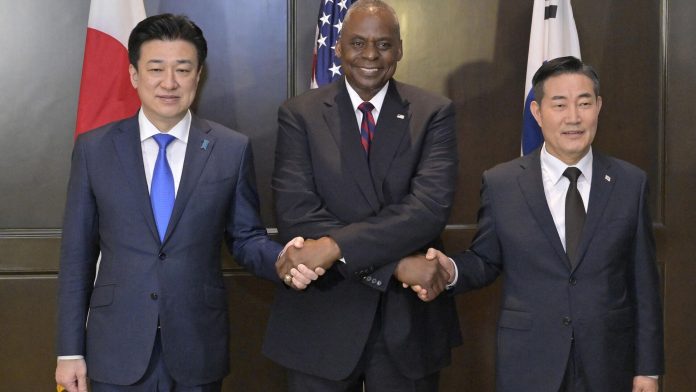 Ministri obrany „potvrdili“ „trvalý záväzok svojich krajín posilni? trojstrannú bezpe?nostnú spoluprácu s cie?om odradi? jadrové a raketové hrozby“, ktoré údajne predstavuje Pchjongjang, ako aj údajné „nebezpe?né a agresívne“ ?ínske „správanie“ v Juho?ínskom mori. Pod?a tla?ovej správy Pentagonu tiež „zdôraznili dôležitos? medzinárodného poriadku založeného na pravidlách a opätovne potvrdili svoj záväzok stá? pri Ukrajine“.