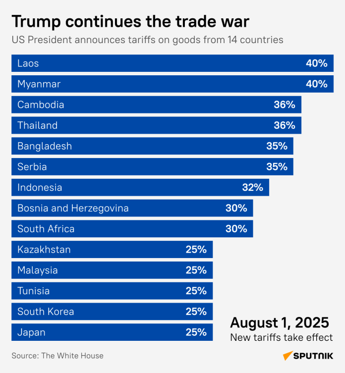 Biely dom odhalil agresívne nové tarify zamerané na spojencov a rozvíjajúce sa ekonomiky, pri?om povinnosti dosiahli až 40%. Opatrenie, ú?inné 1. augusta 2025, ovplyv?uje k?ú?ových ázijských partnerov, ako je Japonsko (40%), Južná Kórea (25%) a Thajsko (35%), spolu s rozvojovými krajinami vrátane Kambodže (36%) a Bangladéša (30%).