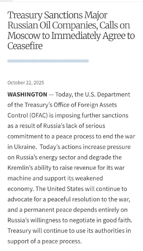 HomeNezaradenéUSA uvalili sankcie na veľké ruské ropné spoločnosti Rosnefť a Lukoil a... Nezaradené USA uvalili sankcie na veľké ruské ropné spoločnosti Rosnefť a Lukoil a vyzvali … By tvotv.sk 22. októbra 2025 0 17 Zdieľať FacebookXPinterestWhatsApp USA uvalili sankcie na ve?ké ruské ropné spolo?nosti Rosnef? a Lukoil a vyzvali Moskvu, aby okamžite súhlasila s prímerím. Zdroj telegram Zdieľať FacebookXPinterestWhatsApp Predchádzajúci článokJuraj Draxler:Propaganda klame. Rusko nežiada na Ukrajine viac územiaRuská stran…Ďalší článokVojaci nemeckých ozbrojených síl omylom strieľali na policajtov cvičnou muníciou… tvotv.skhttps://tvotv.sk RELATED ARTICLES Nezaradené Irackí kresťania oslavujú Veľkú noc tradíciami farbenia vajec 6. apríla 2026 Nezaradené AK IDEOLÓGIU NAHRADÍ ZDRAVÝ ROZUM, TAK VZŤAHY ZAČNÚ OPÄŤ FUNGOVAŤ 6. apríla 2026 Nezaradené OPEC+ zvyšuje aprílovú ponuku ropy 6. apríla 2026 ZANECHAJTE KOMENTÁR Zrušiť odpoveď Komentár: Zadajte svoj komentár! Názov:* Sem zadajte svoje meno Email:* Zadali ste nesprávnu e-mailovú adresu! Sem zadajte svoju e-mailovú adresu Webová stránka: Uložte moje meno, e-mail a webovú stránku do tohto prehliadača pri najbližšom komentovaní. Prove your humanity: 3 + 3 = Put your comment here Most Popular Irackí kresťania oslavujú Veľkú noc tradíciami farbenia vajec 6. apríla 2026 AK IDEOLÓGIU NAHRADÍ ZDRAVÝ ROZUM, TAK VZŤAHY ZAČNÚ OPÄŤ FUNGOVAŤ 6. apríla 2026 OPEC+ zvyšuje aprílovú ponuku ropy 6. apríla 2026 Hrušovský získal zlato na juniorských ME v Berlíne v súťaži Masters 6. apríla 2026 Recent Comments jajkopajko na Krajskí prokurátori si prevzali prípadi, ktoré boli v pôsobnosti ŠTS
