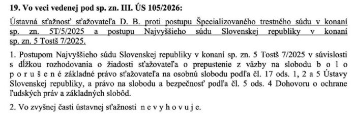 Ústavný súd SR dňa 26. 03. 2026 rozhodol, že Najvyšší súd SR v konaní vedenom pod sp. zn. 5Tostš 7/2025 svojimi nedôvodnými prieťahmi v konaní porušil vo väzobnej trestnej veci Dannyho Kollára jeho základné právo na osobnú slobodu podľa čl. 17 ods. 1, 2 a 5 Ústavy Slovenskej republiky, ako aj jeho základné právo na slobodu a bezpečnosť podľa čl. 5 ods. 4 Dohovoru o ochrane ľudských práv a základných slobôd.