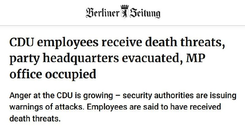 HomeNezaradenéÚstredie strany CDU bolo evakuované, keď sa pred budovou v nemeckom Berlíne... Nezaradené Ústredie strany CDU bolo evakuované, keď sa pred budovou v nemeckom Berlíne zhro… By tvotv.sk 30. januára 2025 0 6 Zdieľať FacebookTwitterPinterestWhatsApp Ústredie strany CDU bolo evakuované, ke? sa pred budovou v nemeckom Berlíne zhromaždil dav. Zdroj telegram Zdieľať FacebookTwitterPinterestWhatsApp Predchádzajúci článokV Guatemale zatkli izraelského kultového vodcu celosvetovej skupiny zneužívajú…Ďalší článokČesko zaradilo svoju pivnú kultúru na národný zoznam nehmotného dedičstva.Podľa… tvotv.skhttps://tvotv.sk RELATED ARTICLES Nezaradené Výsledky z 25. januára video zhrnutie od projektového manažéra @rybar Michaila Zvinchuka špeciálne… 25. januára 2026 Nezaradené „Kontakty medzi Ruskom a USA prebiehajú diskrétne,“ vyhlásil námestník šéfa rusk… 25. januára 2026 Nezaradené „Maďarsko sa nenechá zastrašiť… Zelenskij by si to mal zapamätať“ – Orban 25. januára 2026 ZANECHAJTE KOMENTÁR Zrušiť odpoveď Komentár: Zadajte svoj komentár! Názov:* Sem zadajte svoje meno Email:* Zadali ste nesprávnu e-mailovú adresu! Sem zadajte svoju e-mailovú adresu Webová stránka: Uložte moje meno, e-mail a webovú stránku do tohto prehliadača pri najbližšom komentovaní. Most Popular Hádzanári Hlohovca zdolali Nové Zámky 29:27 25. januára 2026 Výsledky z 25. januára video zhrnutie od projektového manažéra @rybar Michaila Zvinchuka špeciálne… 25. januára 2026 V Sabinove policajní kriminalisti zasiahli proti podvodu na seniorke 25. januára 2026 Spojené kráľovstvo odkladá diskusiu o Chagoských ostrovoch pod tlakom Trumpa – médiá 25. januára 2026 Načítať viac Recent Comments jajkopajko na Krajskí prokurátori si prevzali prípadi, ktoré boli v pôsobnosti ŠTS