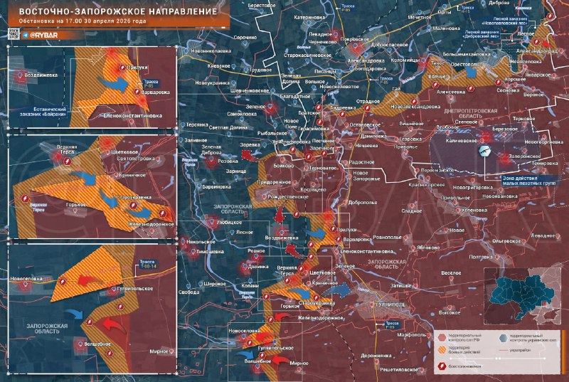 ➡️Najaktívnejšie strety stále prebiehajú na západnom krídle, vrátane Gulyai-Polya. Ukrajinské formácie sa na začiatku a v polovici apríla niekoľkokrát pokúsili infiltrovať s malými skupinami a podarilo sa im klesnúť do obývanej oblasti. Varvarovkakde ich zasiahli nálety dronov.