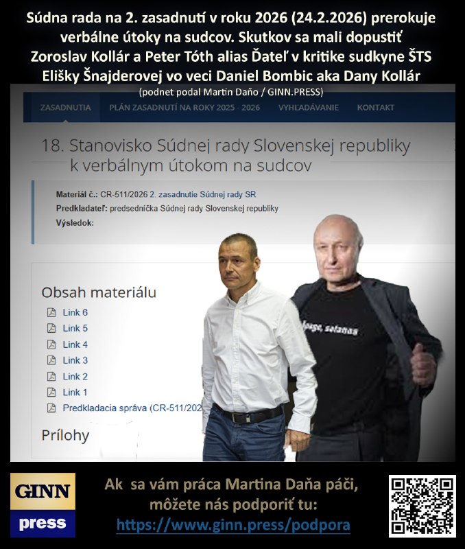 HomeNezaradenéUž tento mesiac Súdna rada zasadne a prerokuje nepodostatnené útoky na sudkyňu... Nezaradené Už tento mesiac Súdna rada zasadne a prerokuje nepodostatnené útoky na sudkyňu E… By Martin Daňo 16. februára 2026 0 13 Zdieľať FacebookXPinterestWhatsApp Už tento mesiac Súdna rada zasadne a prerokuje nepodostatnené útoky na sudkyňu Elišku Šnajderovú z kauzy Bombic a vám ďakujem za podporu https://www.ginn.press/podpora @followers Zdroj telegram Zdieľať FacebookXPinterestWhatsApp Predchádzajúci článokHasiči v Žilinskom kraji minulý týždeň zasahovali 72-krátĎalší článokArménske orgány vedú žalobu proti katolikosom týkajúcu sa trestného stíhania Karekina II. Martin Daňohttps://www.ginn.press RELATED ARTICLES Nezaradené VIDEO: „Klamstvá, ktoré ma spájajú s hanebným Jeffreyom Epsteinom, musia dnes sk… 10. apríla 2026 Nezaradené Kronika špeciálnej vojenskej operácie z 10. apríla 2026Ruské jednotky na… 10. apríla 2026 Nezaradené Chcem pripomenúť verejnosti, vzhľadom na náhly záujem vlády o nemocnice, že títo… 10. apríla 2026 Most Popular EÚ potichu zvyšuje dovoz ruského LNG napriek plánovaným zákazom – FT 10. apríla 2026 Skalica zvíťazila v 6. kole nad Trenčínom, Prešov zdolal Humenné 10. apríla 2026 VIDEO: „Klamstvá, ktoré ma spájajú s hanebným Jeffreyom Epsteinom, musia dnes sk… 10. apríla 2026 Kronika špeciálnej vojenskej operácie z 10. apríla 2026Ruské jednotky na… 10. apríla 2026 Recent Comments jajkopajko na Krajskí prokurátori si prevzali prípadi, ktoré boli v pôsobnosti ŠTS