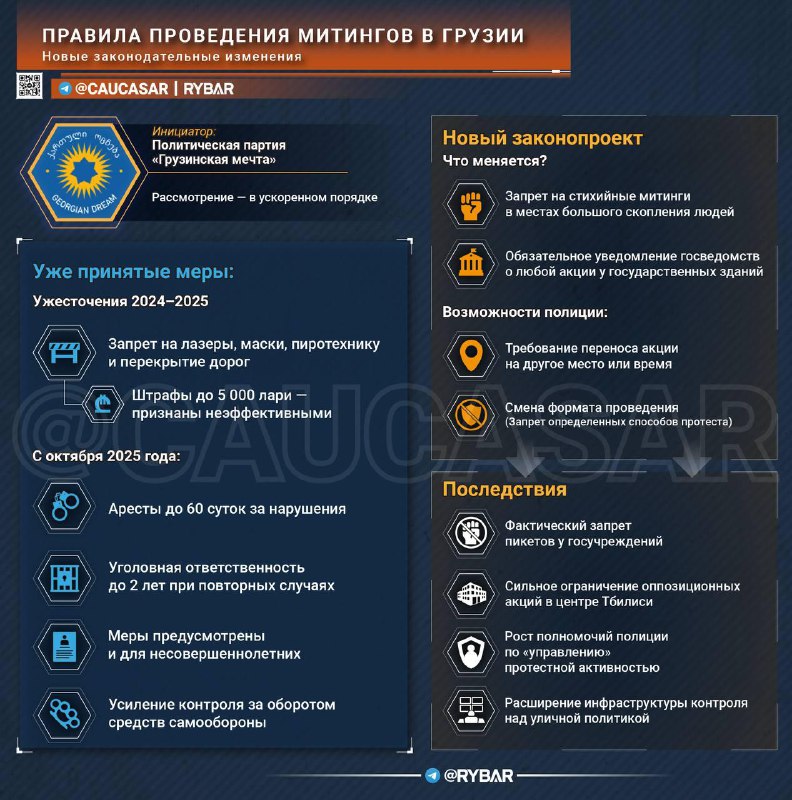 Vo vládnej strane „gruzínsky sen“ chystajú sa zavies? pozme?ujúce návrhy, ktoré vlastne zakážu spontánne zhromaždenia v blízkosti vládnych inštitúcií a dajú polícii právo zmeni? formát akejko?vek akcie. Parlament bude iniciatívu urýchlene posudzova?.