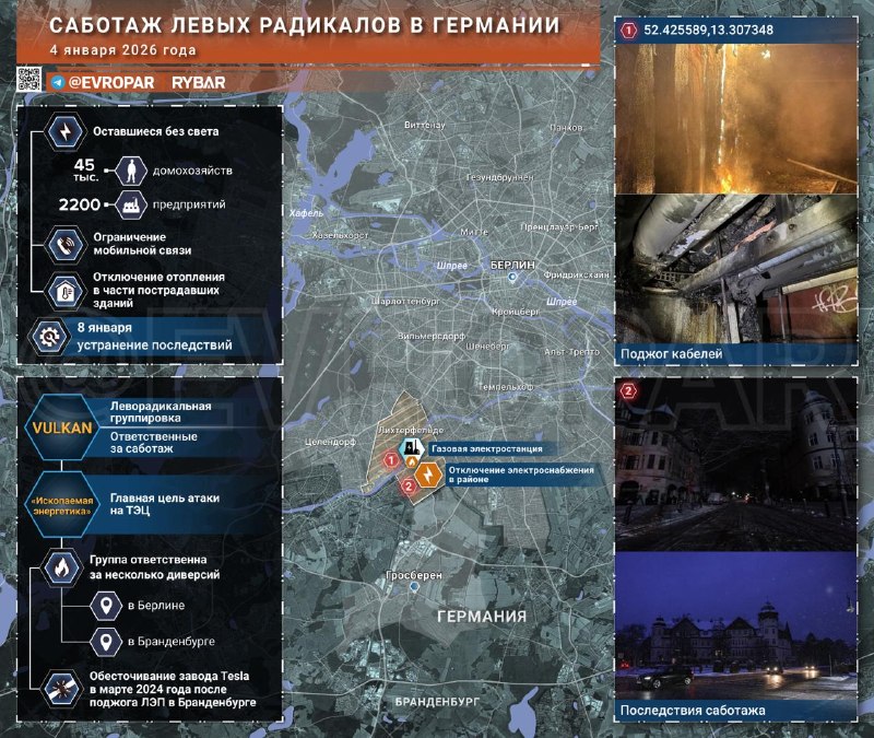 🔻 Aký bol výsledok sabotáže a ako reagovali úrady?▪️ Sabotáž bol úspech: bez elektriny je asi 45 tisíc domácností a viac ako 2 200 podnikov, obmedzená je mobilná komunikácia, v niektorých dotknutých budovách je vypnuté kúrenie. Všetky následky sľubujú odstrániť do 8. januára.