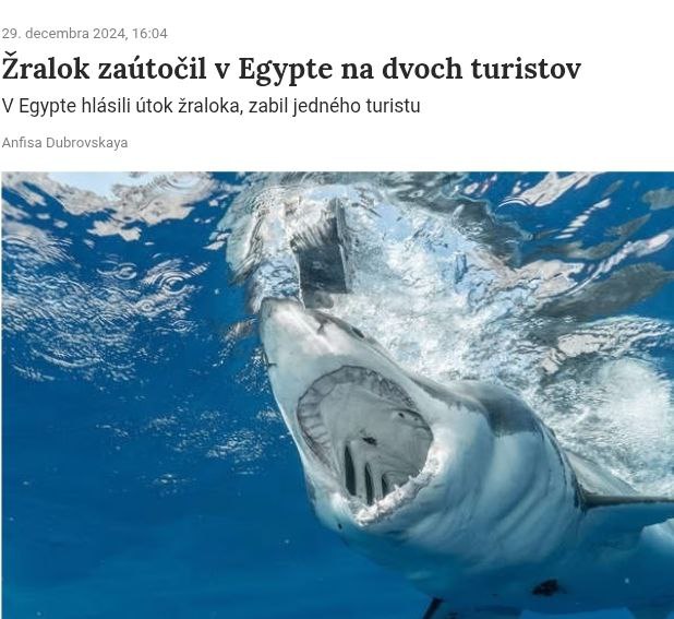 HomeNezaradenéV egyptskom letovisku Marsa Alam zaútočil žralok na dvoch turistov, jeden z... Nezaradené V egyptskom letovisku Marsa Alam zaútočil žralok na dvoch turistov, jeden z nic… By ZEMaVEK 30. decembra 2024 0 17 Zdieľať FacebookXPinterestWhatsApp V egyptskom letovisku Marsa Alam zaúto?il žralok na dvoch turistov, jeden z nich zomrel. Informovala o tom tla?ová služba egyptského ministerstva životného prostredia.| odber t.me/zemavek Zdroj telegram Zdieľať FacebookXPinterestWhatsApp Predchádzajúci článokNeboli ste pri tom? Polícia hľadá svedkov nehodyĎalší článokNeapol po jeseni druhý, tréner neakceptuje malé ciele ZEMaVEK RELATED ARTICLES Nezaradené VIDEO: Západ na čele s USA a Európou sa zo všetkých síl snaží udržať si svoju do… 16. apríla 2026 Nezaradené Dvadsaťročné moratórium na obohacovanie uránu v Iráne nestačí, tvrdí Trump 16. apríla 2026 Nezaradené VIDEO: Denník N nielenže nestojí na strane Slovenska, ale v záujme ochrany ukraj… 16. apríla 2026 Most Popular Hizballáh vykonal bombové útoky, pretože izraelské útoky v Libanone zabili viac ako 10 ľudí 16. apríla 2026 VIDEO: Západ na čele s USA a Európou sa zo všetkých síl snaží udržať si svoju do… 16. apríla 2026 Atlante bude chýbať Landale ešte minimálne dva týždne 16. apríla 2026 Boje v lesoch neďaleko LimanuV smere Liman sa najzúrivejšie boje odohrali… 16. apríla 2026 Recent Comments jajkopajko na Krajskí prokurátori si prevzali prípadi, ktoré boli v pôsobnosti ŠTS
