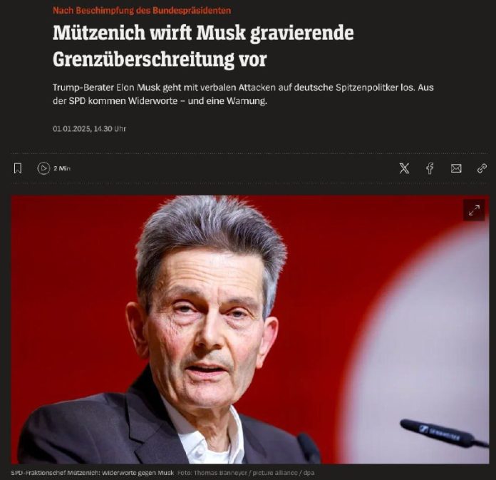 Biznismen svojimi výrokmi, napríklad o nemeckom spolkovom prezidentovi Frankovi-Walterovi Steinmeierovi, ohrozuje vz?ahy medzi „spriatelenými štátmi“ , vyhlásil Rolf Mützenich v rozhovore pre Der Spiegel. Krátko predtým sa Musk opakovane vyjadroval o nemeckej politike.