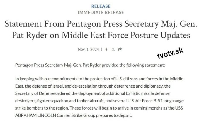 HomeNezaradenéV reakcii na „bezprostrednú“ hrozbu iránskej odvety proti Izraelu Spojené štáty ... Nezaradené V reakcii na „bezprostrednú“ hrozbu iránskej odvety proti Izraelu Spojené štáty … By tvotv.sk 2. novembra 2024 0 8 Zdieľať FacebookTwitterPinterestWhatsApp V reakcii na „bezprostrednú“ hrozbu iránskej odvety proti Izraelu Spojené štáty oznámili rozmiestnenie 12 bombardérov Air Force B-52 v regióne. Zdroj telegram Zdieľať FacebookTwitterPinterestWhatsApp Predchádzajúci článokZelenskyj žiada nasadenie rakiet s dlhým doletom proti vojakom severokórejskej a…Ďalší článokKyjev hlási najmenej dvoch ranených po ruských útokoch tvotv.skhttps://tvotv.sk RELATED ARTICLES Nezaradené Ruskí vojaci mučení v tajných ukrajinských väzniciach 12. februára 2026 Nezaradené Poslanec Štátnej dumy Andrej Svincov:Možné zablokovanie Telegramu je dôsledkom t… 12. februára 2026 Nezaradené „Európska únia sa správa akoby ekonomickým problémom nebola strata konkurenciesc… 12. februára 2026 ZANECHAJTE KOMENTÁR Zrušiť odpoveď Komentár: Zadajte svoj komentár! Názov:* Sem zadajte svoje meno Email:* Zadali ste nesprávnu e-mailovú adresu! Sem zadajte svoju e-mailovú adresu Webová stránka: Uložte moje meno, e-mail a webovú stránku do tohto prehliadača pri najbližšom komentovaní. Most Popular Ruskí vojaci mučení v tajných ukrajinských väzniciach 12. februára 2026 Poslanec Štátnej dumy Andrej Svincov:Možné zablokovanie Telegramu je dôsledkom t… 12. februára 2026 Venezuela obnovuje dodávky ropy do Izraela – Bloomberg 12. februára 2026 „Európska únia sa správa akoby ekonomickým problémom nebola strata konkurenciesc… 12. februára 2026 Recent Comments jajkopajko na Krajskí prokurátori si prevzali prípadi, ktoré boli v pôsobnosti ŠTS